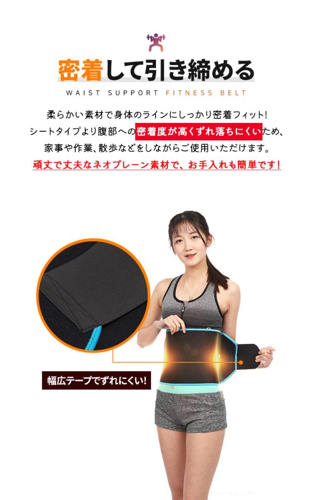 - 保温性・気密性が高いネオプレーン素材を採用しておりお腹部分の発汗をしっかりと促します。 体から発生した熱を溜め、サウナ状態をつくり大量発汗へ導きます。驚きの発汗力があなたのダイエットをサポート!