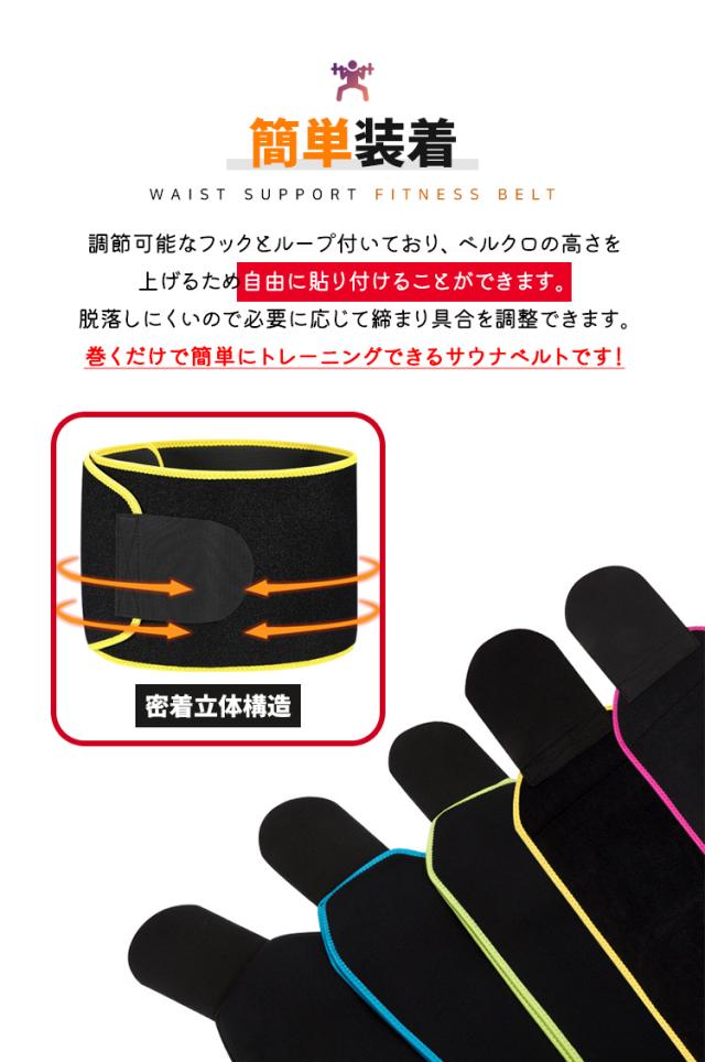 - 調節可能なフックとループ付いており、 ベルクロの高さを上げるため自由に貼り付けることができます。脱落しにくいので必要に応じて締まり具合を調整できます。巻くだけで簡単にトレーニングできるサウナベルトです!