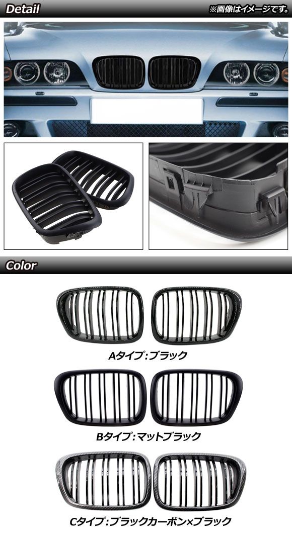フロントグリルカバー BMW 5シリーズ E39 4ドア車用 1996年〜2004年 ブラック Aタイプ ABS製 ダブルバー AP-FG327-A 入数:1セット(2個)