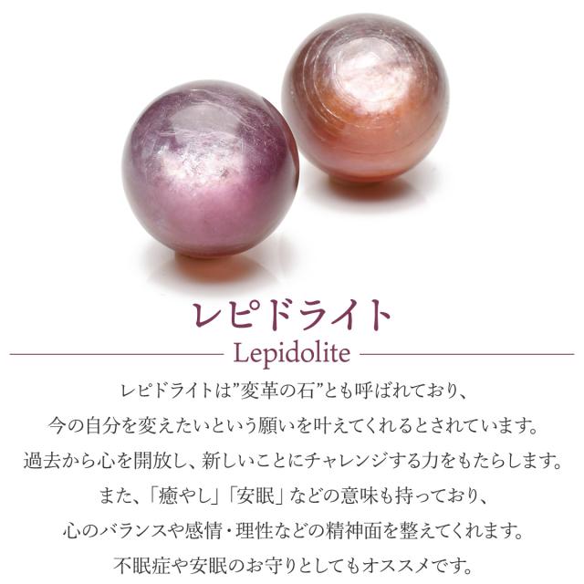 | 特徴・意味 | 藤色パールのような艶感と特有のシラー効果が美しく上品です。 レピドライトは、キラキラとしたうろこ状の結晶が特徴である雲母の一種。 雲母自体はよくある鉱物ですが、リチウムを多く含むことによって淡い紫やピンク色に染まったものが、レピドライトと呼ばれています。 トルマリンやクンツァイトなどと一緒に見つかることが多く、混合結晶が産出されることもあるようです。 雲母は結晶の軸に沿って一定の方向に割れやすい性質を持っています。 レピドライトは硬度が2.5〜4と柔らかい石のため、強い衝撃には注意が必要です。 レピドライトは変革の石と呼ばれ、新しい物事へ挑戦する時に身に付けると良いでしょう。 環境の変化を受け入れられるようになります。 高いリラックス作用でストレスを軽減するといわれることから、高ぶった精神を落ち着かせたり、安眠や疲労回復のお守りとして用いられる「レピドライト」。 うつがちで気分が落ち込んでしまった人には、ゆったりとした穏やかな気持ちをもたらしたり、落ち着きがない人には、冷静さと忍耐力を養うことで、物事に集中して取り組めるよう支えてくれます。 |