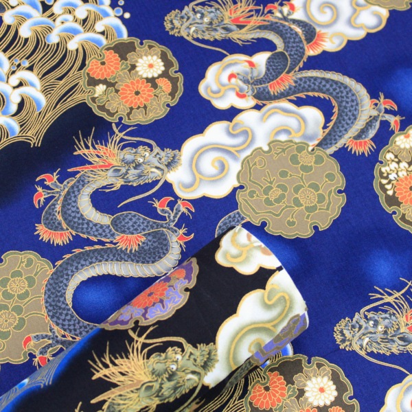 【10cm単位価格】 昇り龍 雲と荒波 雪輪文様 金ラメ 和柄 シーチング 綿100% 生地 布 約110cm幅 ゆうパケット2.5m対応