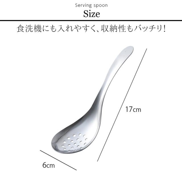 ちょっと短めでたっぷりすくえる。絶妙サイズの穴あき取りわけスプーン。穴あきだから汁切りしてすくえる!