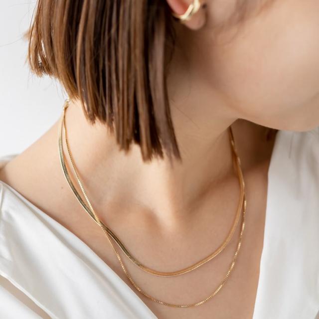 ベネチアンチェーンとスネークチェーンをあしらった、シンプルな二重チェーンネックレス。