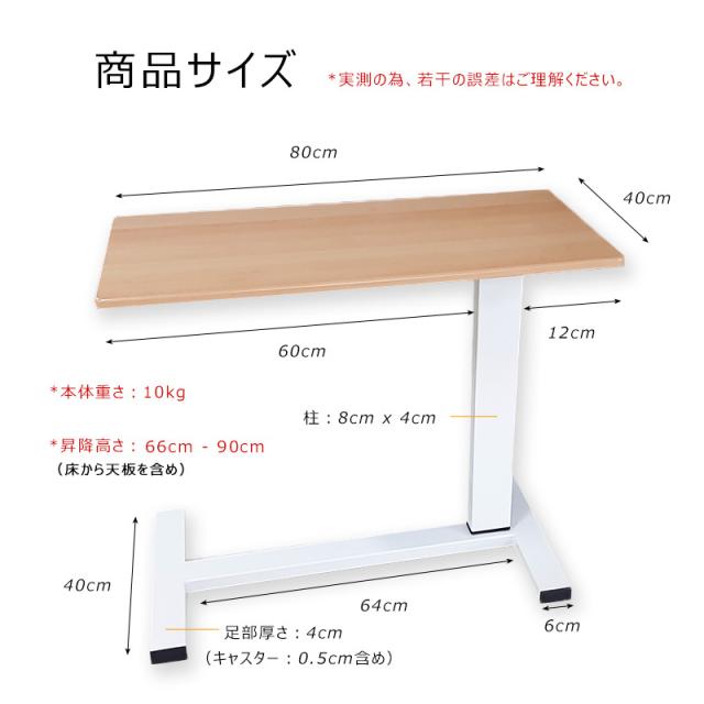 昇降式サイドテーブル ベッドテーブル キャスター付き 幅80cm 介護テーブルオーバーテーブル ソファーテーブル 調整可能 昇降式デスク