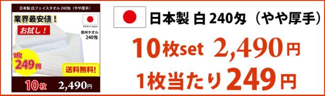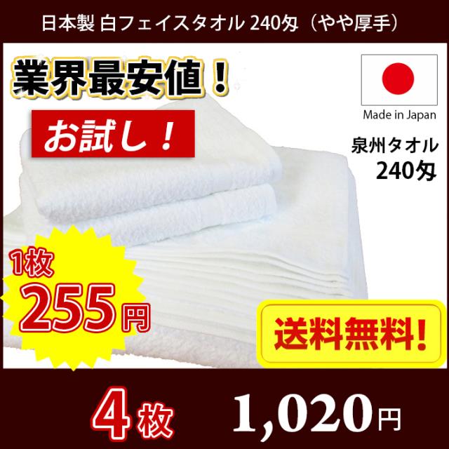 【送料無料】業界最安値! お試し4枚セット 日本製 泉州 白タオル やや厚手 240匁 / タオル 普通のタオル 白いタオル 業務用タオル フェイス 白 ホワイト 業務用 理髪店 掃除 雑巾 まとめ買い 国産 買い回り