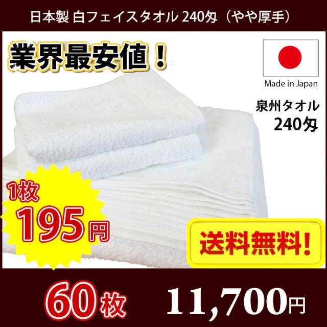 【送料無料】業界最安値! 60枚セット 日本製 泉州 白タオル やや厚手 240匁 / タオル 普通のタオル 白いタオル 業務用タオル フェイス 白 ホワイト 業務用 理髪店 掃除 雑巾 まとめ買い 国産