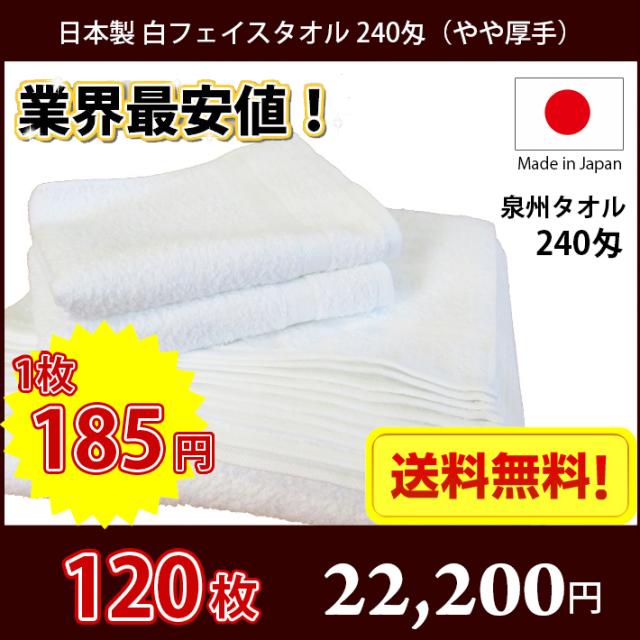 【送料無料】業界最安値! 120枚セット 日本製 泉州 白タオル やや厚手 240匁 / タオル 普通のタオル 白いタオル 業務用タオル フェイス 白 ホワイト 業務用 理髪店 掃除 雑巾 まとめ買い 国産