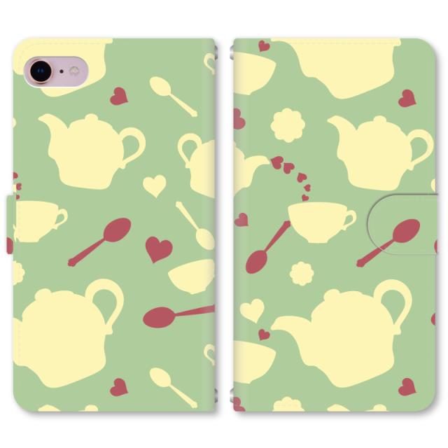 スマホケース 手帳型 iPhone13 iPhoneSE2 アイフォン 8 aquos sense GooglePixel xperia galaxyなど多機種制作対応 m3489_紅茶ポットとカップGrn