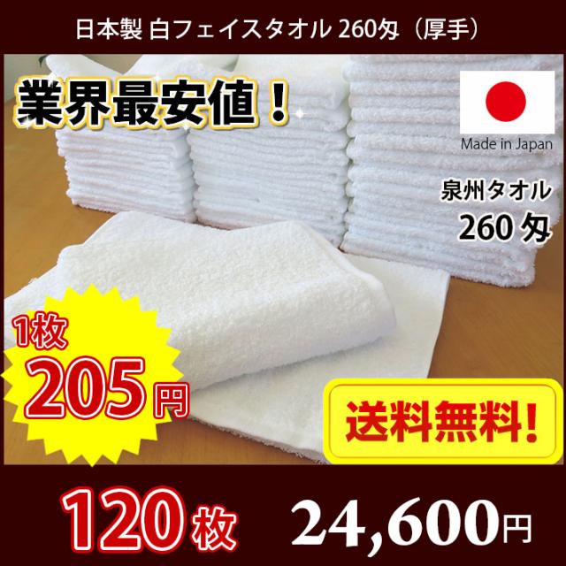 【送料無料】業界最安値! 120枚セット 日本製 泉州 白タオル 厚手 260匁 / タオル 業務用タオル フェイス 白 ホワイト 業務用 理髪店 美容院 美容室 床屋 掃除 まとめ買い 国産