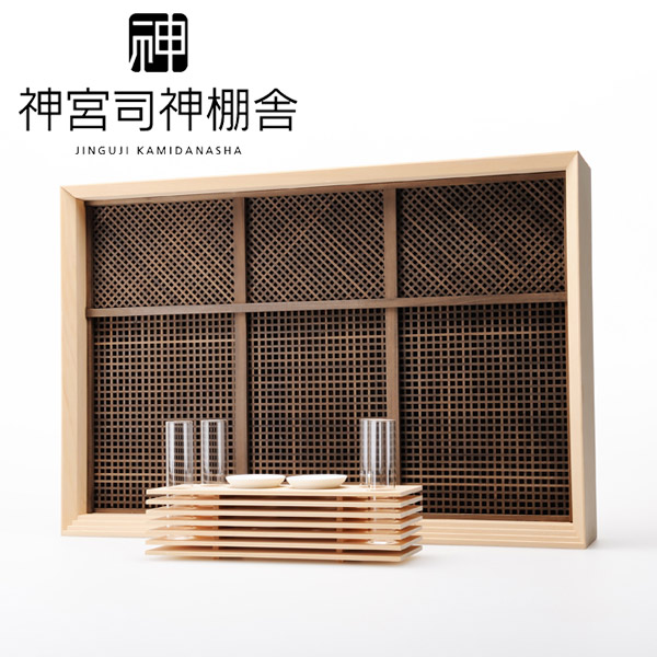 こちらは職人の技が光るスクエアでシンプルな形と緻密な面格子のコントラストが印象的な三祀御社と神饌を供える際に使用する神具台のセット