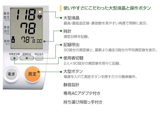 | 2人×90回分の測定値メモリ付き | |