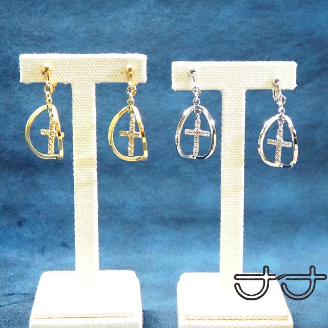 送料無料 イヤリング 揺れる ネジバネ式 十字架モチーフ ラインストーン 曲げ加工フープ