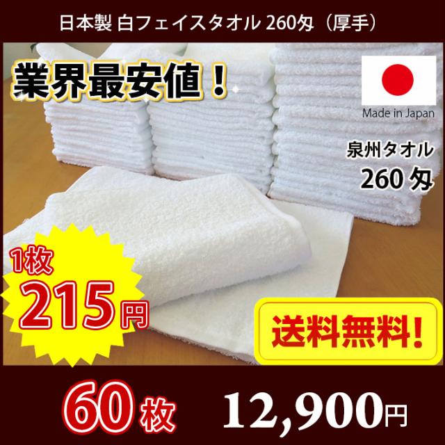 【送料無料】業界最安値! 60枚セット 日本製 泉州 白タオル 厚手 260匁 / タオル 業務用タオル フェイス 白 ホワイト 業務用 理髪店 美容院 美容室 床屋 掃除 まとめ買い 国産
