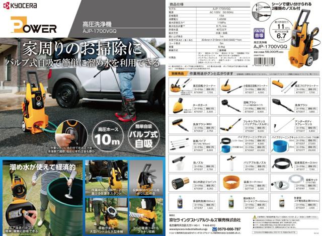京セラ 高圧洗浄機 AJP-1700VGQ ハイエンドモデル 高圧ホース10m 圧力調節 バルブ式自吸 KYOCERA リョービ 大型商品