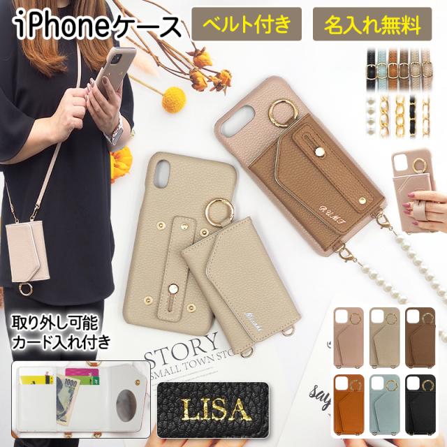 スマホケース スマホカバー iPhoneケース【レザー×ベルト付き×カード入れ ミラー ロングストラップ付き×箔 型押し名入れ】スマホショルダー スマホバンド付き カード収納 背面 ギフト 名入れ無料 メール便送料無料 受注生産