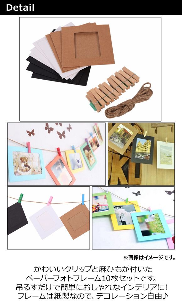 かわいいクリップと麻ひもが付いたペーパーフォトフレーム10枚セットです。