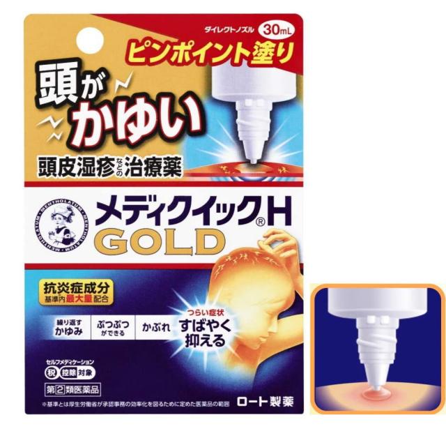 | ◆メディクイックHゴールドの特長 「頭皮湿疹」とは、髪の毛で覆われた頭部、髪の生え際などにみられるかゆくてつらい湿疹やかぶれのこと ○「頭皮のかゆみ」に着目した「メンソレータム メディクイックHゴールド」は、抗炎症成分を基準内最大量配合(※1)。○PVA(アンテドラッグステロイド※2)+グリチルレチン酸の高い消炎効果で、炎症・かゆみをしっかり鎮めます。 ○患部に容器を押し当てると「ピンポイント」に薬液がでるダイレクト容器を採用。 ○スーッとクールな使い心地です。 ※1:一般用鎮痒消炎薬製造販売承認基準の最大量(濃度)配合 ※2:患部で効果を発揮し、体内に吸収されると分解して低活性の物質にかわるステロイドのこと ◆メディクイックHゴールドの有効成分表示 1ml中 プレドニゾロン吉草酸エステル酢酸エステル(PVA)〈アンテドラッグステロイド〉・・・1.5mg グリチルレチン酸・・・10mg クロタミトン・・・50mg アラントイン・・・2mg イソプロピルメチルフェノール・・・1.5mg l-メントール・・・35mg 添加物として、エタノール、1.3-ブチレングリコール、ラウロマクロゴール、疎水化ヒドロキシプロピルメチルセルロース、pH調節剤、ヒアルロン酸Naを含有する。 ◆メディクイックHゴールドの効能効果 湿疹、皮フ炎、かゆみ、かぶれ、じんましん、あせも、虫さされ ◆メディクイックHゴールドの用法用量 1日数回、適量を患部に塗布してください。 患部に容器を押し当てるとピンポイントに薬液が出てきます。 髪の毛があって塗りにくい頭皮に使いやすく、手や髪の毛を汚さずに、患部にだけ薬液を届けることができます。 ◆メディクイックHゴールドの用法用量の注意事項 1.用法・用量を厳守してください。 2.小児に使用させる場合には、保護者の指導監督のもとに使用させてください。 3.目に入らないようご注意ください。万一、目に入った場合には、すぐに水またはぬるま湯で洗ってください。なお、症状が重い場合には、眼科医の診療を受けてください。 4.外用のみにご使用ください。 5.使用前に、容器を上に向け、手の指で容器先端を押して中の空気を抜いてください。
