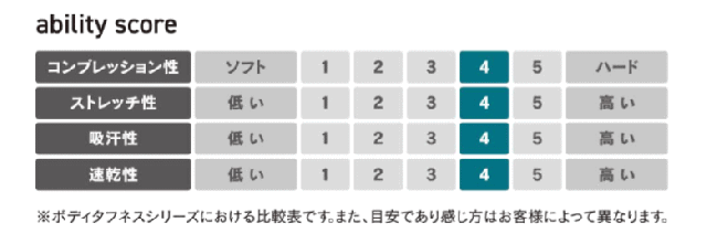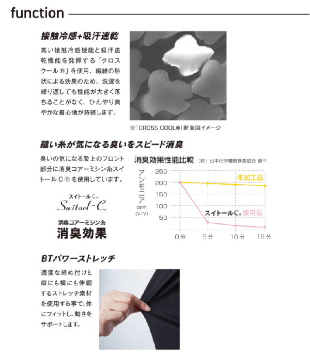 ・BTパワーストレッチ:適度な締め付けと縦にも横にも伸縮するストレッチ素材を使用する事で、体にフィットし、動きをサポートします