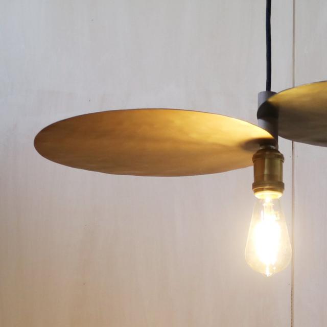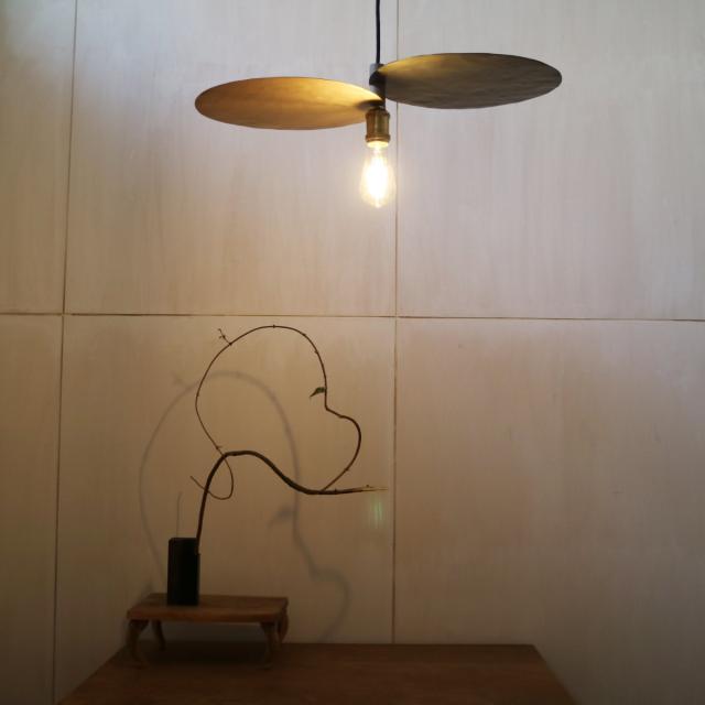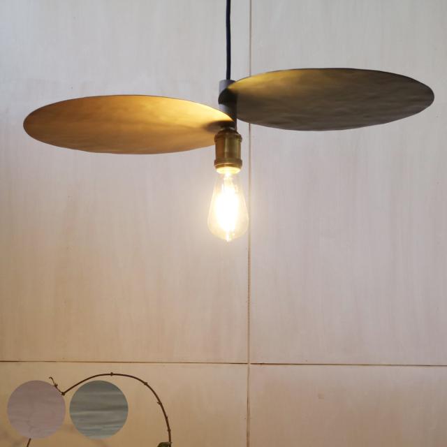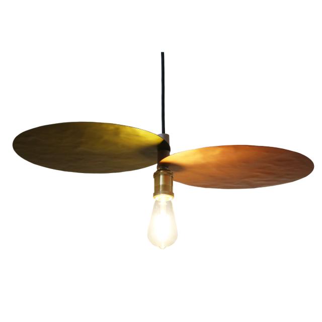 存在感のある羽のようなシェードが美しいペンダントライトです。真鍮の落ち着いた輝きがアンティークな雰囲気を醸し出します。灯りをともすと美しい光の陰影がお部屋に広がり、どこか懐かしいノスタルジックな空間を演出します。