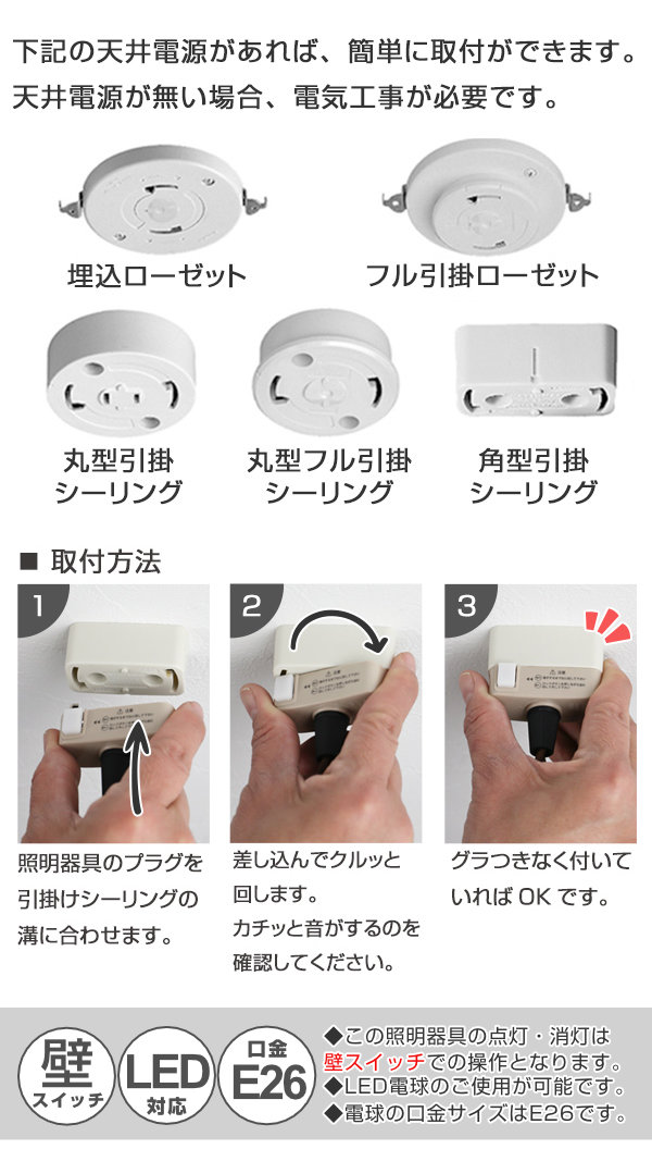 | 備考 | 点灯:壁スイッチ 取付方法:引っ掛けシーリング 電球:LED球/E26-7W LEDエジソン球、電球色(白熱60W相当)2400K 810lm |