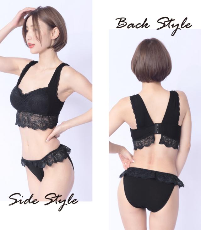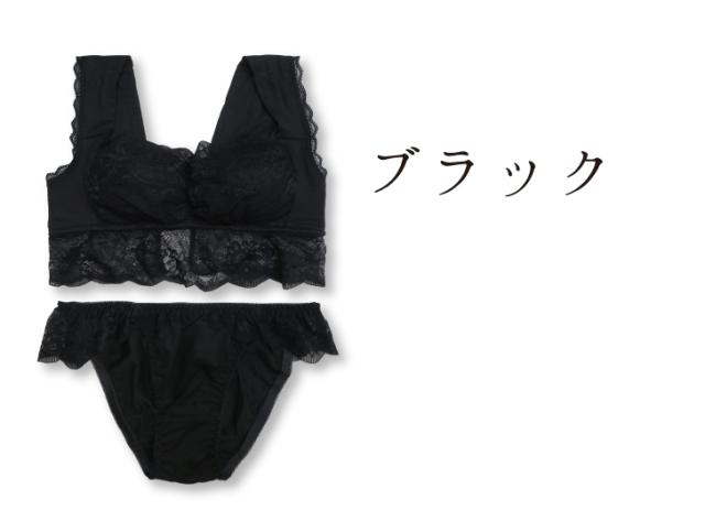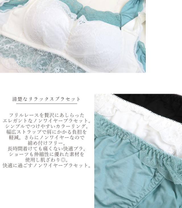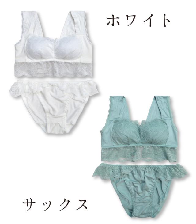 フリルレースを贅沢にあしらったエレガントなノンワイヤーブラセット。シンプルでつけやすいカラーリング。幅広ストラップで肩にかかる負担を軽減。さらにノンワイヤーなので締め付けフリー。長時間着けても痛くない快適ブラ。ショーツも伸縮性に優れた素材を使用し肌ざわり◎。快適に過ごすノンワイヤーブラセット。