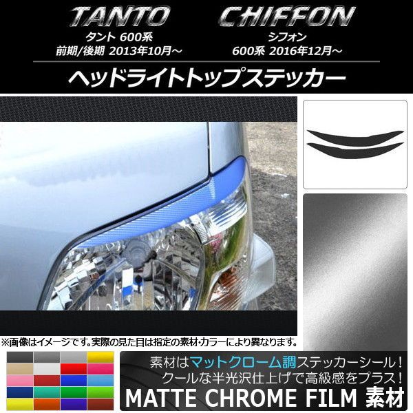ヘッドライトトップステッカー ダイハツ/スバル タント/シフォン LA600/LA610 マットクローム調 選べる20カラー 入数:1セット(2枚) AP-MTCR1248 カラー: ブラック ホワイト レッド ブルー イエロー グリーン オレンジ パープル ピンク ネイビー ブラウン ボルドー ゴールド シルバー ガンメタリック マゼンタ ライトグリーン ライトブルー ライトゴールド シアン