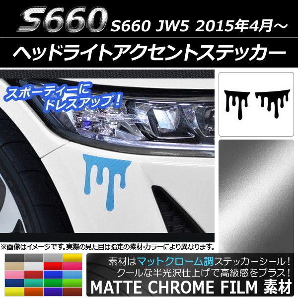 ヘッドライトアクセントステッカー マットクローム調 液だれ風 ホンダ S660 JW5 2015年4月〜 選べる20カラー 入数:1セット(2枚) AP-MTCR1996 カラー: ブラック ホワイト レッド ブルー イエロー グリーン オレンジ パープル ピンク ネイビー ブラウン ボルドー ゴールド シルバー ガンメタリック マゼンタ ライトグリーン ライトブルー ライトゴールド シアン