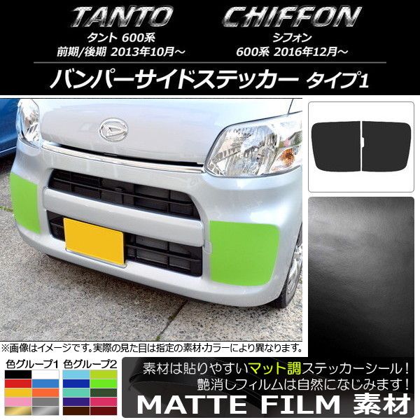 バンパーサイドステッカー ダイハツ/スバル タント/シフォン 600系 カスタム不可 マット調 タイプ1 色グループ2 入数:1セット(2枚) AP-CFMT1260