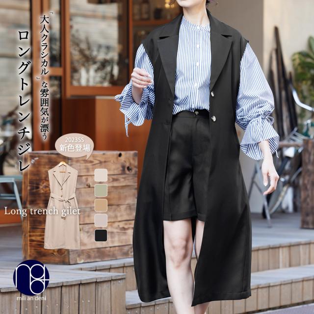 春新作 ロングトレンチジレ トレンチベスト ロングベスト トレンチコート ウェストベルト レディース 春夏ベスト コート アウター ロング M ミリアンデニ (ネコポス) a225009