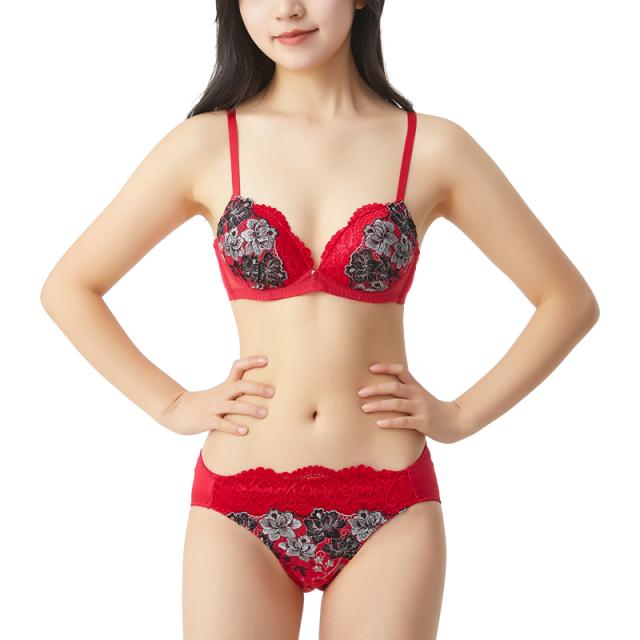 エレガントな刺繍とニットレースを重ねたノンワイヤーブラジャー&ショーツ