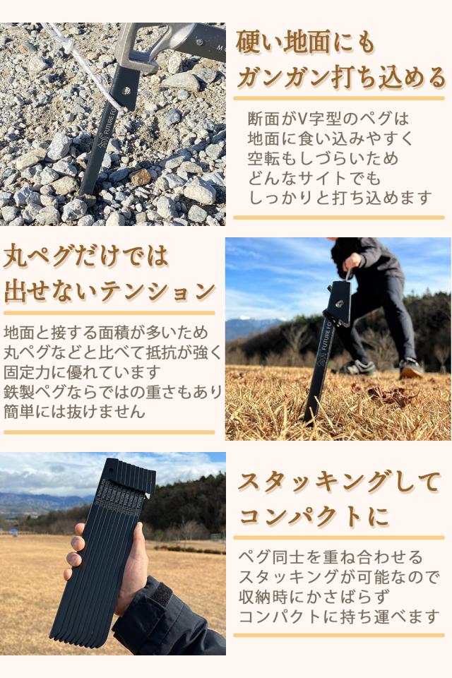 ??鉄製で断面がV字型のペグなので、地面に食い込みやすく様々なサイトでご使用いただけます。またV字の溝に砂が入り込むので丸型のペグと比べ抵抗が強く固定力に優れています。