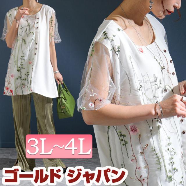 秋新作 大きいサイズ レディース トップス ブラウス シャツ 花刺繍チュールレースブラウス 半袖ブラウス 半袖トップス 半袖 半そで 刺繍 花柄 チュール シアー ボタン クルーネック Tシャツ 透け感 花刺繍 ロング 切替え 柄 夏服 春服 3L 4L ホワイト 白 ゴールドジャパン