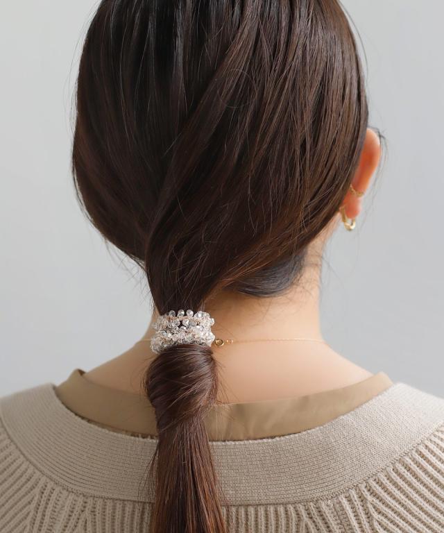 光を受けて煌めくビーズが、女性らしい華やかなうしろ姿を演出するシュシュ。