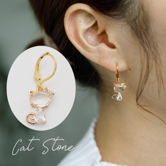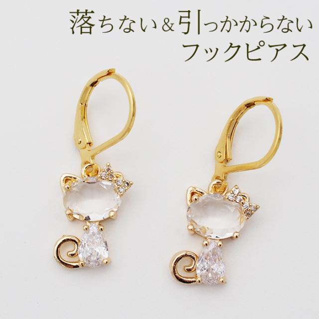 ピアス 金属アレルギー サージカルステンレス フック 落ちない 引っかからない 外れにくい フック 猫×ラインストーン ピアス カラビナ シンプル かわいい