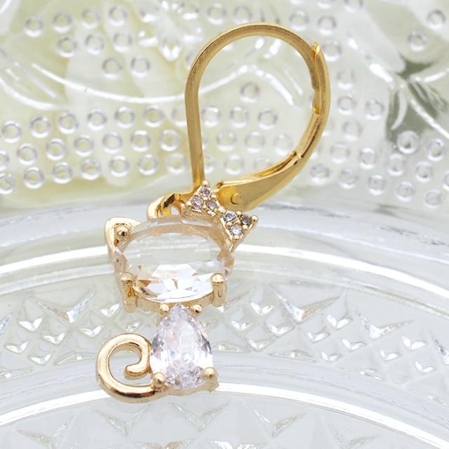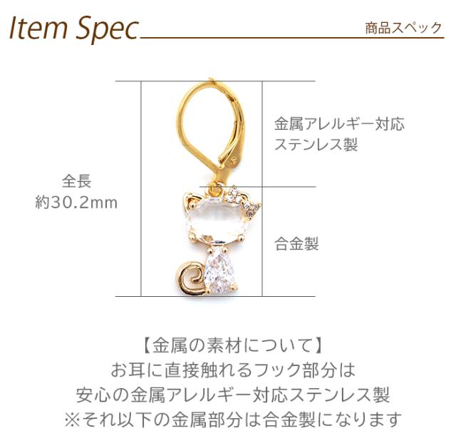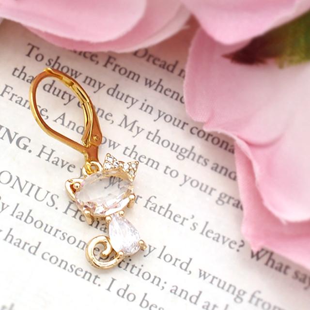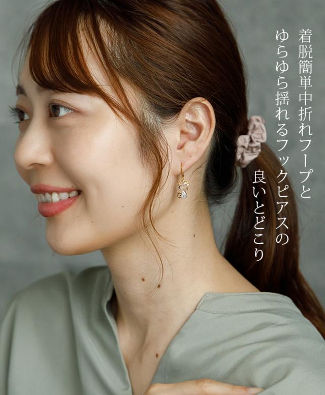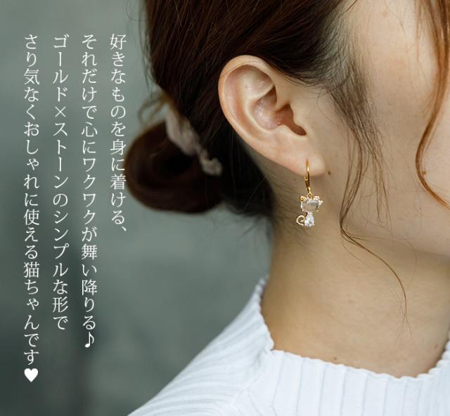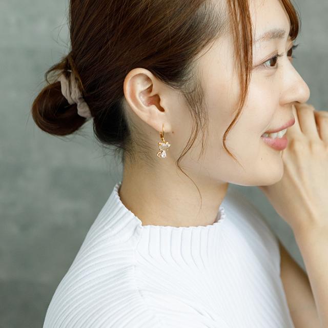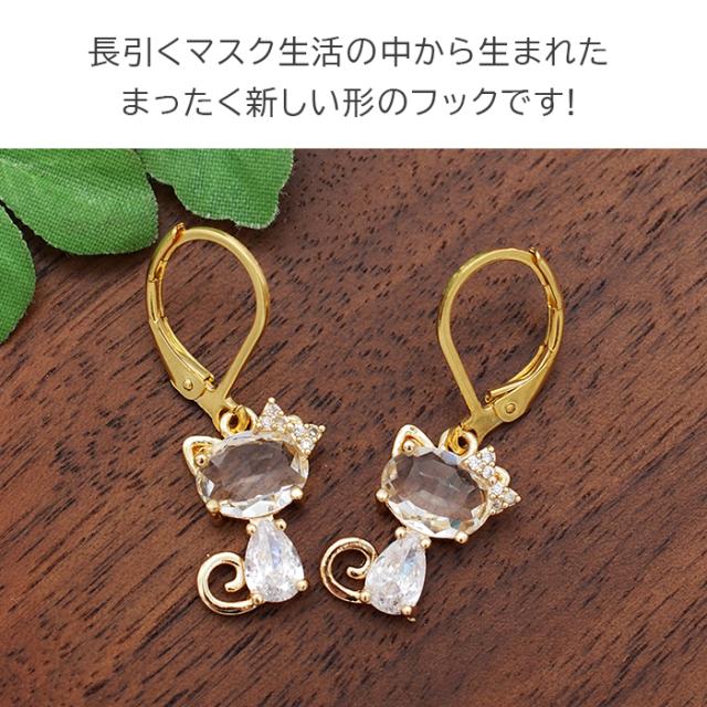 | 着脱簡単で引っかからない中折れフープとゆらゆら揺れるフックピアスの良いとこ取りな、まったく新しい形のフックピアスができました! シンプルな形状× 透明なラインストーンなので悪目立ちせず、大人女性にも似合う愛らしさです♥ 愛らしいニャンコがゆらゆら揺れる姿に、きっと気持ちも癒されるはず♪ |