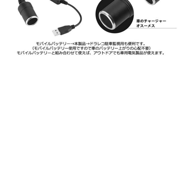 ・USBをモバイル電源、USB充電器、PCのUSBポートなどに接続し、メス側はカーエレクトロニクス、レーダー検出器などに接続