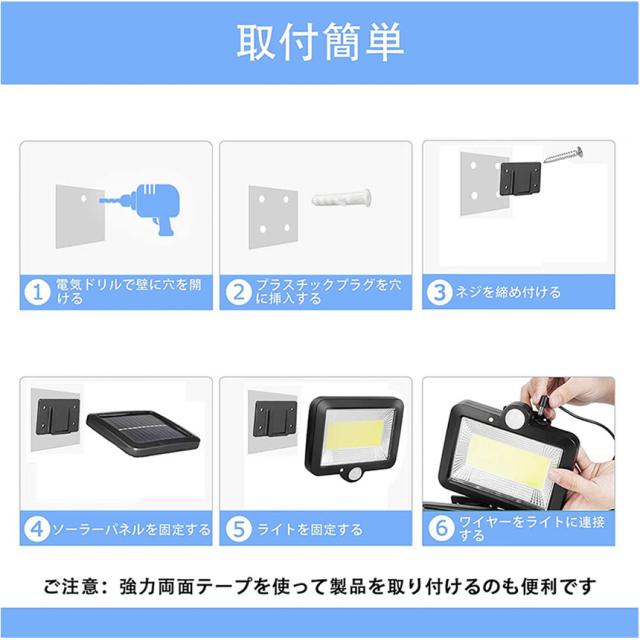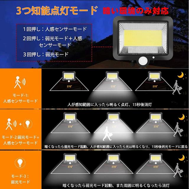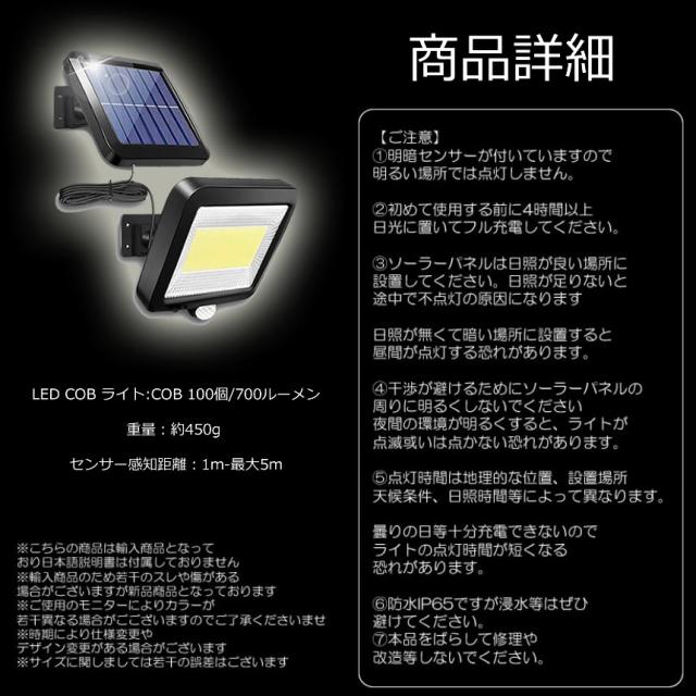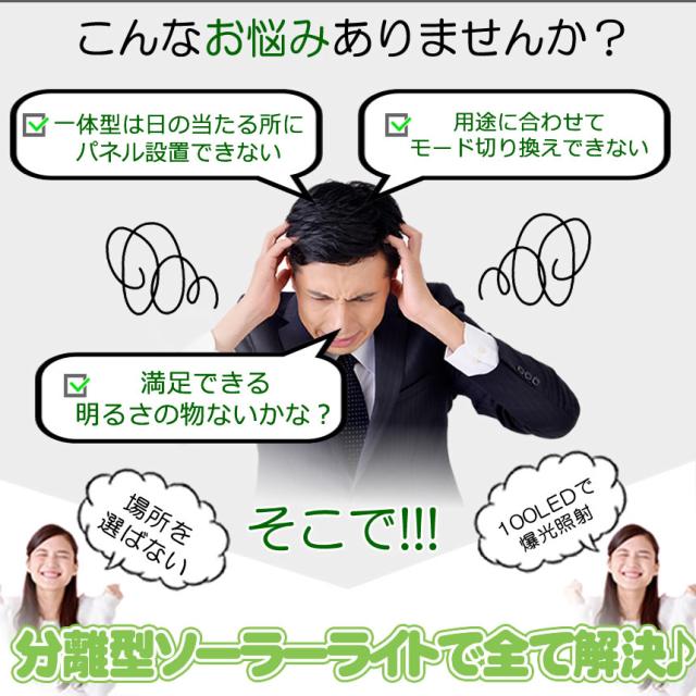 - 追記。 到着/使用してから6日目に、2個のうち1個に照度的な不具合が発生しました。ストアに連絡したら、充電不足なので再度充電し、様子をみてからまた連絡して欲しいとの事でした。 指示通りにしてみましたが、やはり改善されなかったので改めて連絡しましたが、未だに回答無しで放置状態!!余程商品に自信が有るようで、恐らくクレーマーとしての対応なんでしょうか…一週間の保証的な記載事項も書かれてましたがデタラメのようです。もうここのストアでは買いません。 注文から発送まで早くて有難いです。梱包は商品が入った箱が、合わさる形で包装されてました。箱も意外と頑丈なのか潰れも無かったです。 開封して設置…説明書は入ってませんが、本体を台に差し込むだけなので、物を見れば分かります。なお今回、付属のネジは長いので使わず、自分で用意した短いネジを使いました。 早速点灯させてみると、直視出来ないレベルで明るいです。MODE変更もソーラー充電もバッチリです。ソーラー用ケーブルが5m有るのも重宝します。何より以前購入した800円/個位の物は、3日ともたないクソ商品ばかりでしたが、現在5日過ぎても問題なく使用できてます。最初からこの商品にしておけば良かったです。 なお、私は室内で使用しているので問題無いですが、雨ざらしの屋外設置される方は、ケーブル接続部にシール処理をお勧めします。