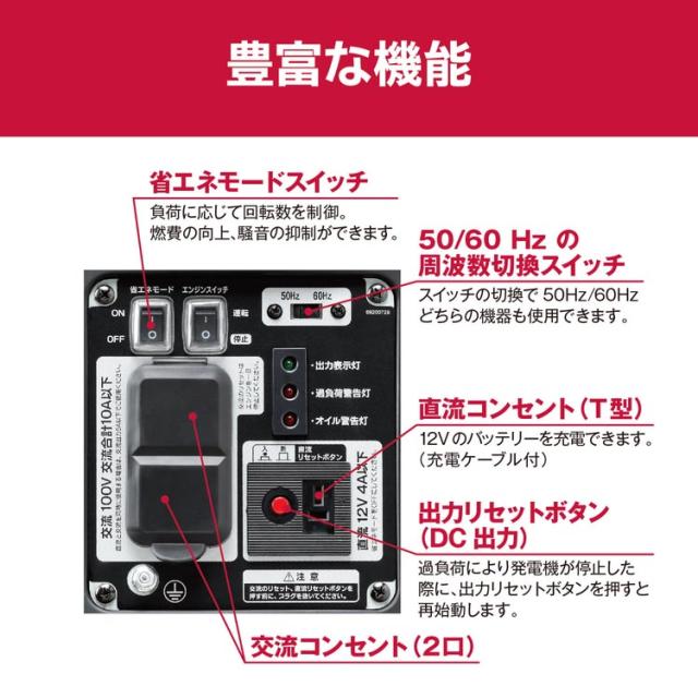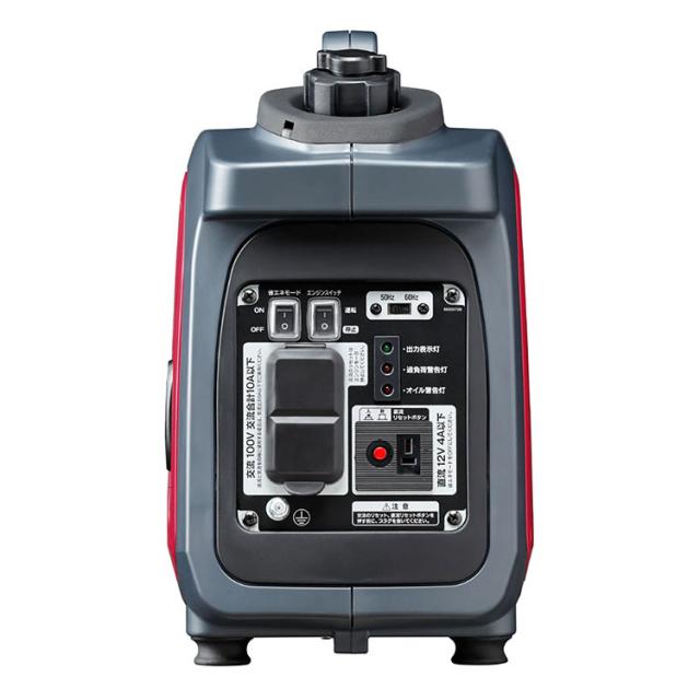 | 電圧調整方式:インバーター式 始動方式:リコイルスターター(手動) 発電機形式:多極界磁回転型 定格電圧(100V(交流)・12V(直流))・定格出力1000W 定格電流:10A(交流)・4A(直流) 形式:フルカバードタイプ 連続使用時間:3.5時間(定格負荷)・6.9時間(1/4負荷エコモード) 品名コード:664700A |