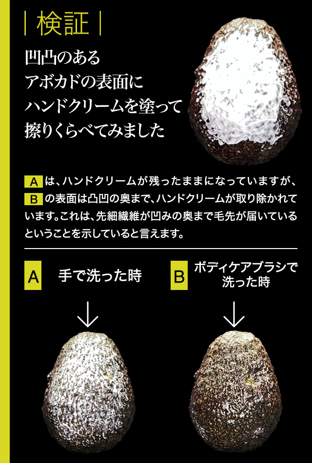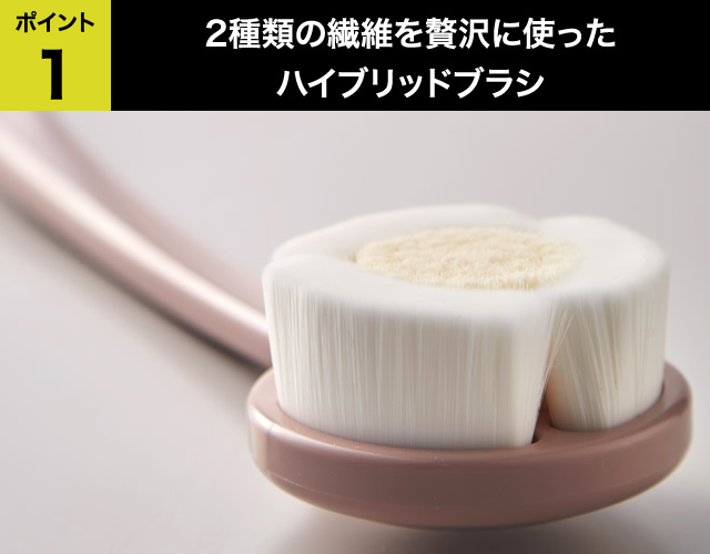 新開発のボディケアブラシには、それぞれ別の特徴を持った2種類の繊維が使われています。
