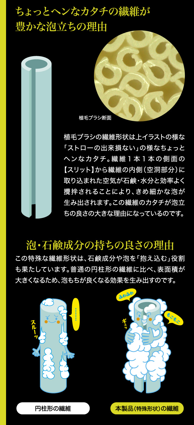 そしてもうひとつは特殊断面形状繊維を用いた植毛ブラシ。