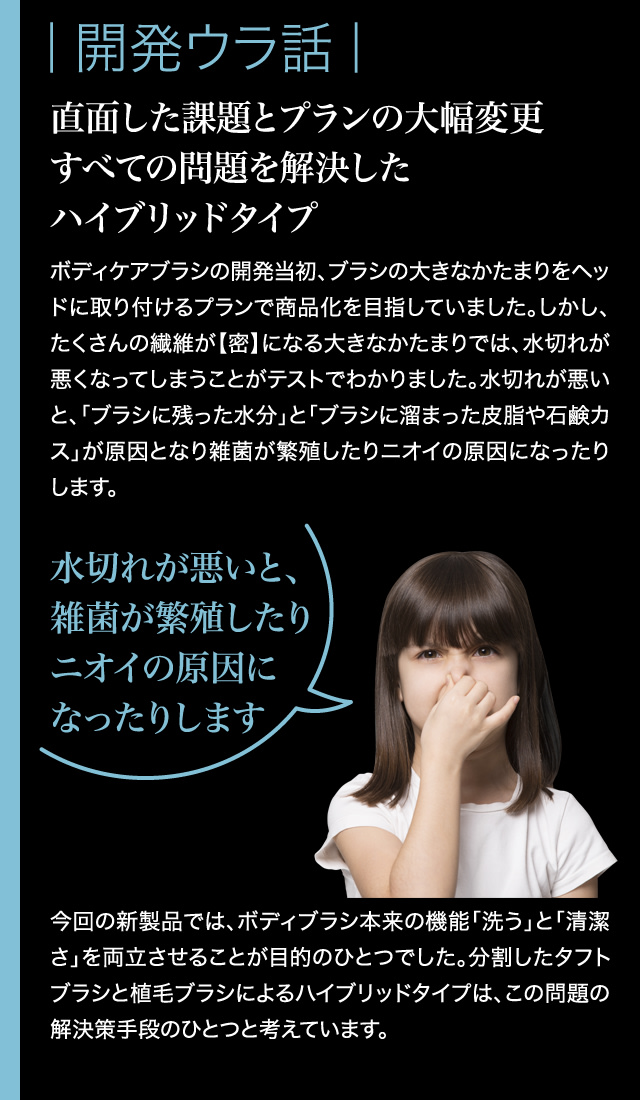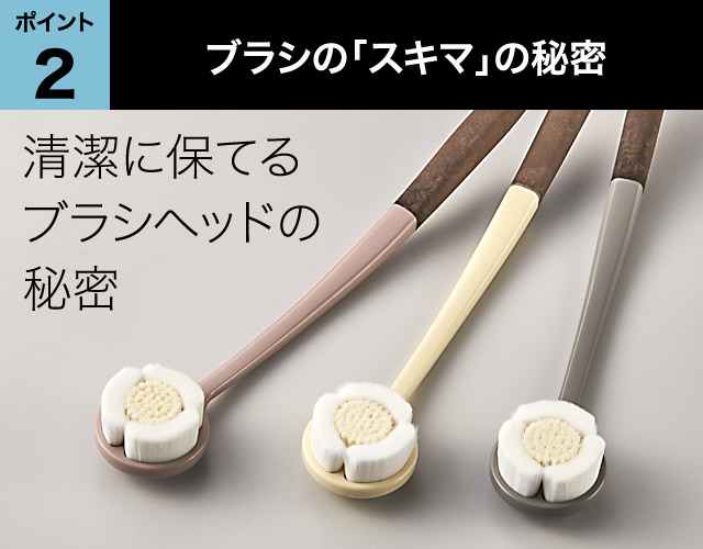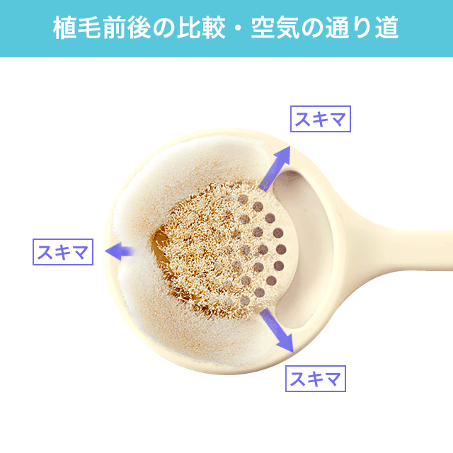 特にブラシの中央部を、スキマが多数ある「植毛」タイプにしていることが、このブラシの水切れの良さを実現したポイント。ブラシの中央部は、「植毛」タイプにすることで、繊維の密度を適度に減らし、空気に触れやすくしているのです。また、外側の「タフトブラシ」の間にも「スキマ」を設けていますが、このスキマが中央部でたまった水分の通り道にもなっているのです。