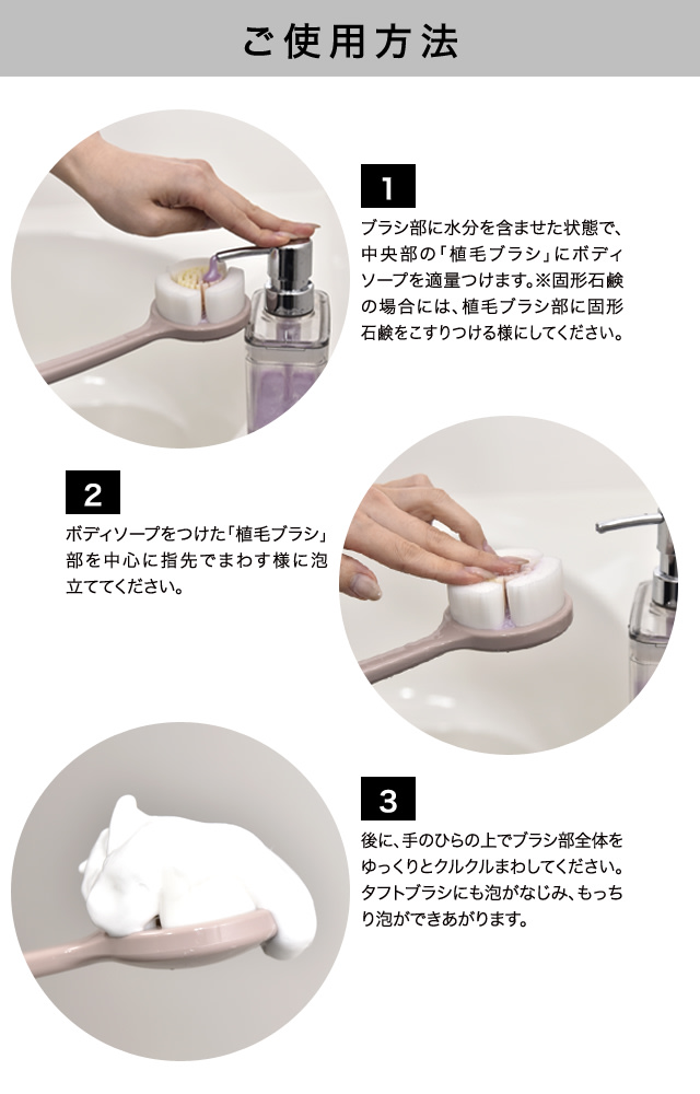タフトブラシの繊維の根元の直径は0.1mmと極細。さらにその繊維は根本から毛先に向かって徐々に細くなる先細形状です。 ボディケアブラシには、この特殊な先細形状の繊維を贅沢に約21万本も使用しているため、その肌あたりはとってもやわらかふわふわ。 タフトブラシは、その先細形状の特徴(根本はしっかり毛先はやわらか)から、肌にあたる時には程よい弾力と柔らかさが感じられます。 さらに、1ブロック約7万本×3ブロック=約21万本の束感が生み出す肌当たりにはうっとりするほどです。