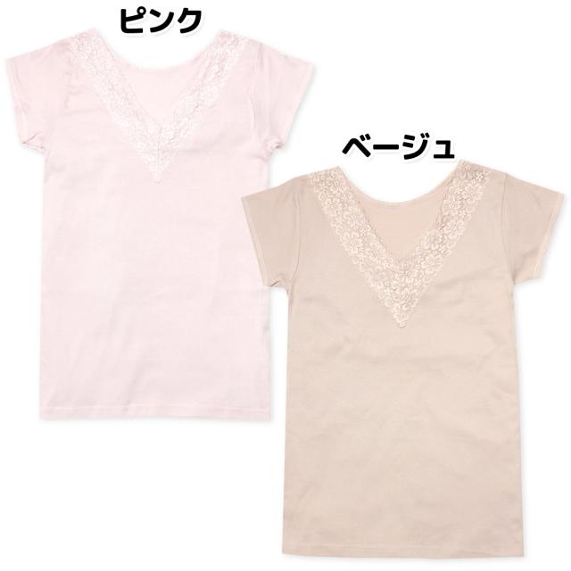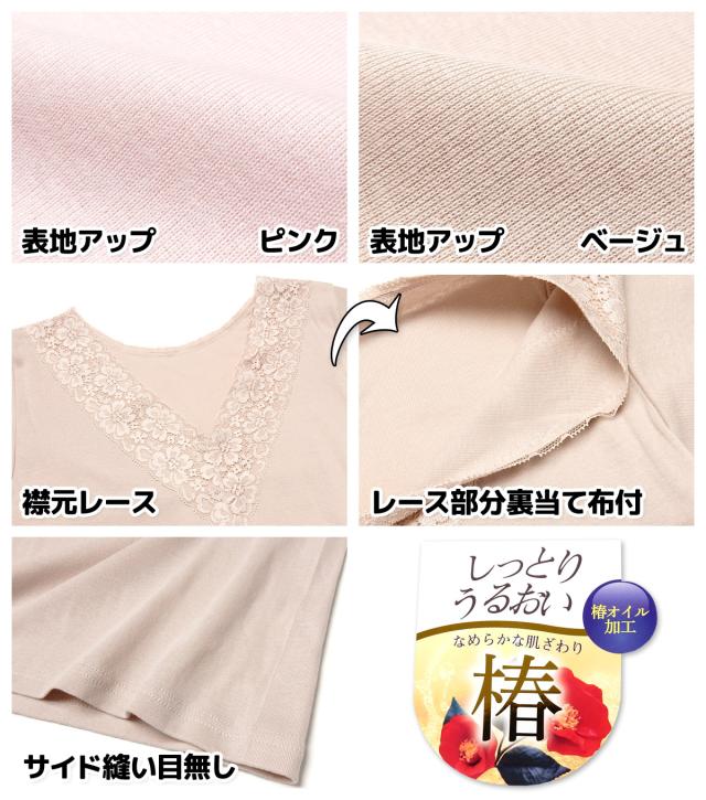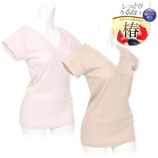 【送料無料】レディース 婦人 椿オイル加工 フレンチ袖 インナー シャツ 肌着 下着 身生地綿100% 広幅 しっとりうるおい なめらかな肌触り Vレース M L LL yg-1075【メール便対応】