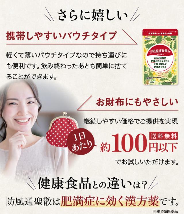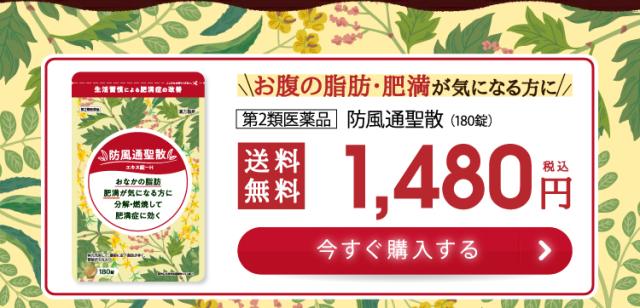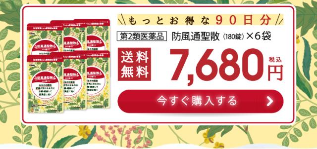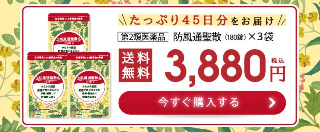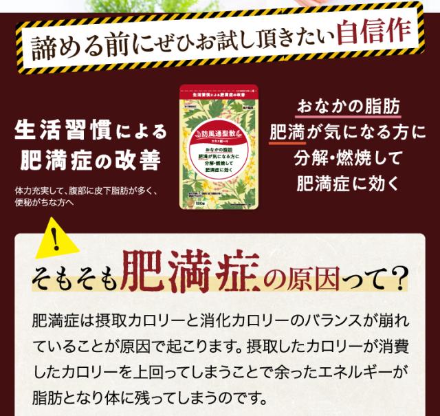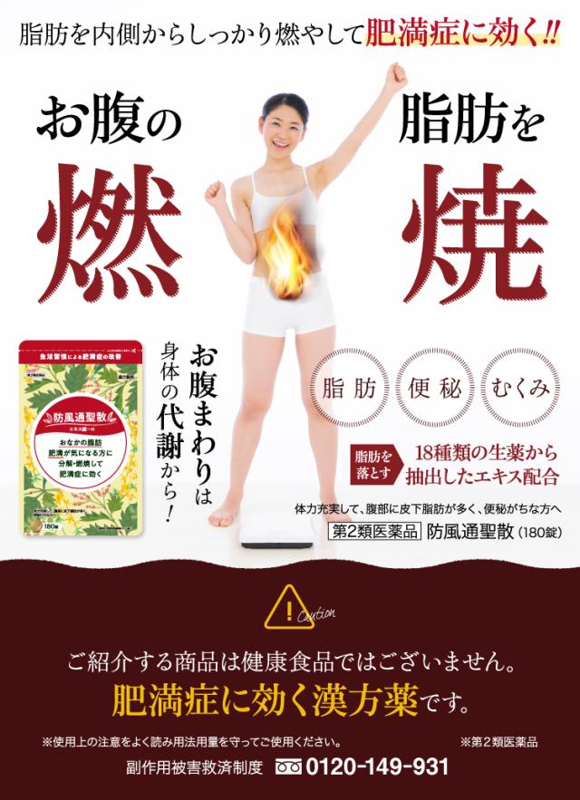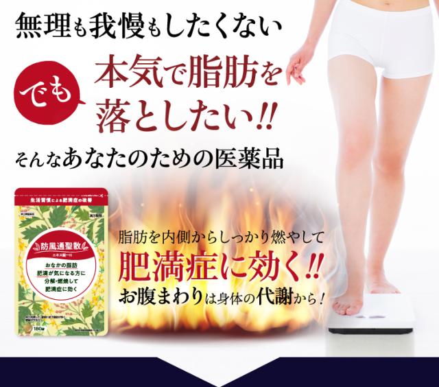 12錠〔大人1日服用量〕中、次の成分を含有する。 防風通聖散水製乾燥エキス末(キキョウ1.00g、ビャクジュツ1.00g、カンゾウ1.00g、オウゴン1.00g、セッコウ1.00g、ダイオウ0.75g、トウキ0.60g、シャクヤク0.60g、センキュウ0.60g、サンシシ0.60gg、レンギョウ0.60g、ハッカ0.60g、ケイガイ0.60g、ボウフウ0.60g、マオウ0.60g、ショウキョウ0.20g、カッセキ1.50g、ボウショウ0.75g より抽出)