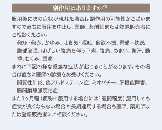 4. 1ヵ月位(便秘に服用する場合には1週間位)服用しても症状がよくならない場合は服用を中止し、この文書を持って医師、薬剤師又は登録販売者に相談してください。