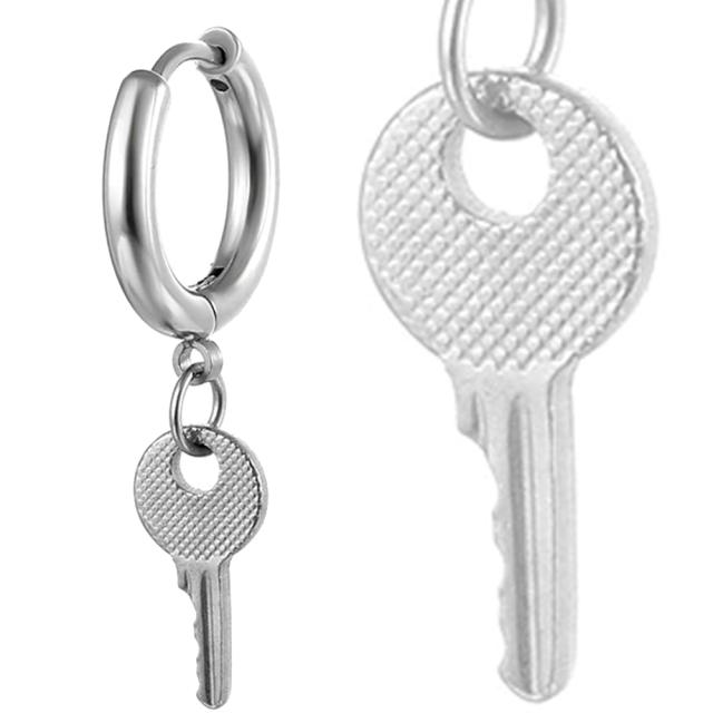 太くて小さめのシンプルなリングピアスにリアルなカギのチャームが揺れるおしゃれなステンレスピアス。