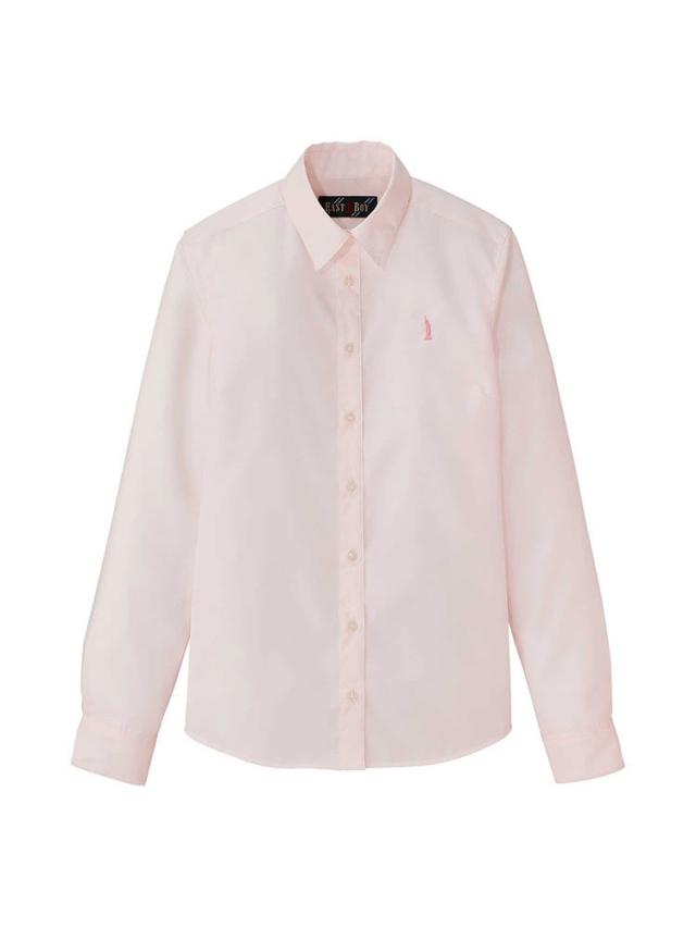綿100%なので着心地抜群。シワになりにくいモイストキュア加工でお手入れ簡単です。ボタンの間隔を狭くし、胸元の開きが気にならない位置にしています。袖口のボタンは2段階の調節可能で、フィット感を調節できます。襟元はメンズシャツと同様の立ち襟仕様。首のラインに添って、襟元がすっきり見えるのが特徴で、ネクタイやリボンも美しく決まります。ボタンはオリジナル仕様、EASTBOYの刻印入り。 左胸に女神刺繍入り。<モイストキュア加工>特殊な形態安定加工をほどこすことにより、綿の風合いや光沢をそのままに、シワになりにくい特性があります。