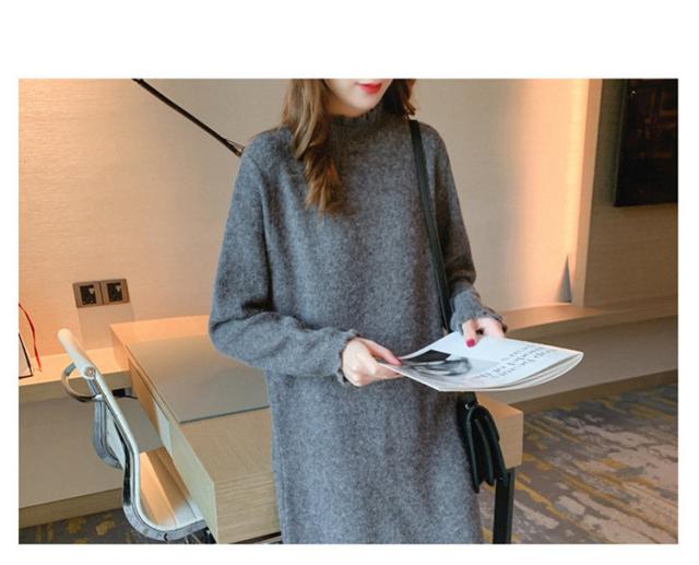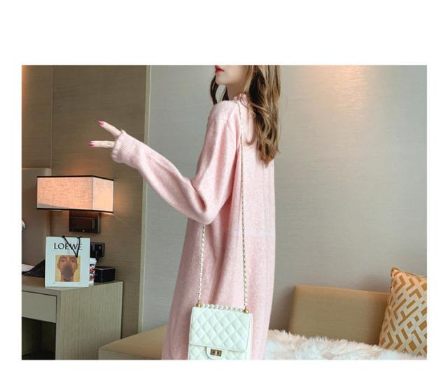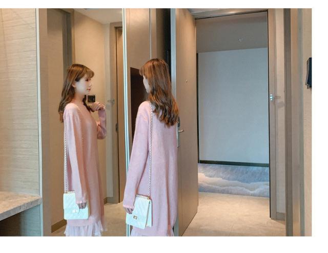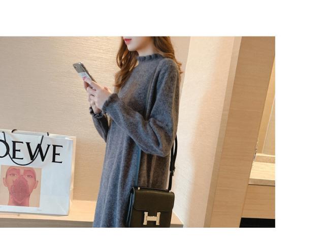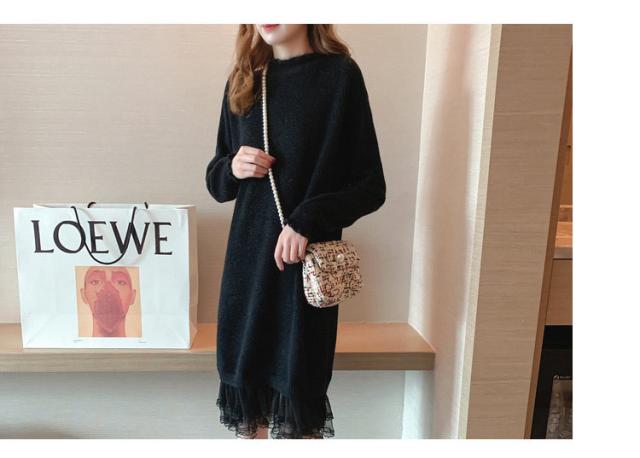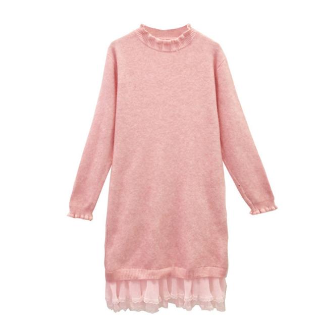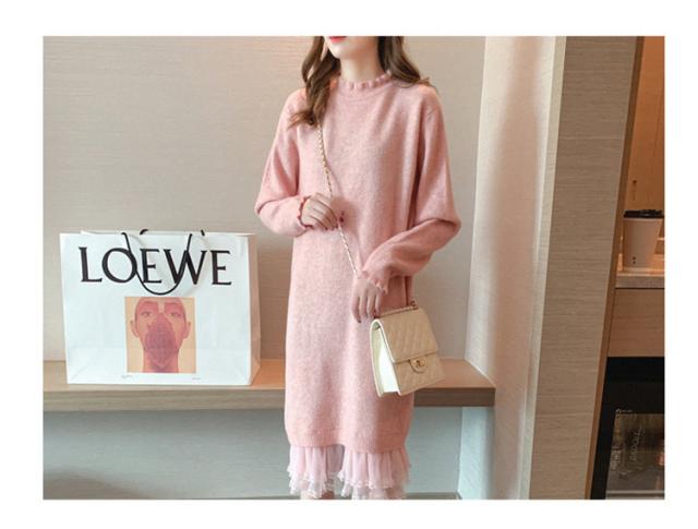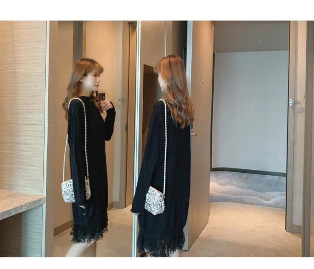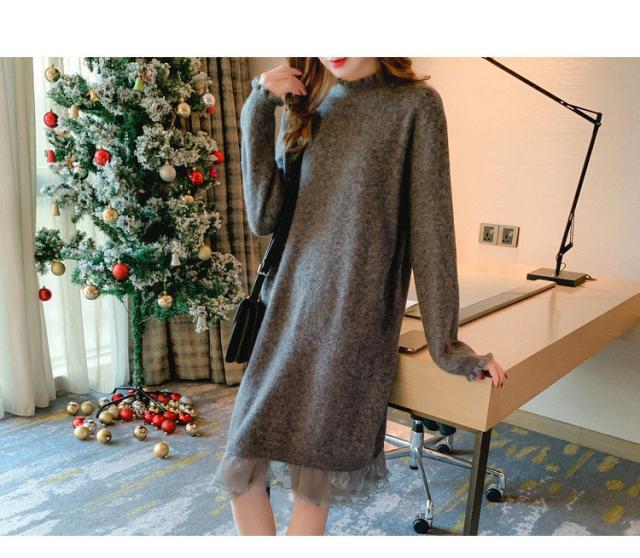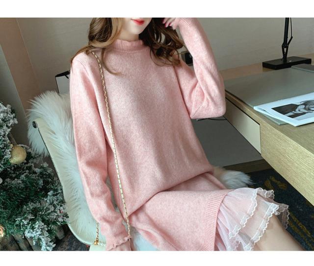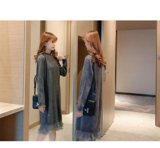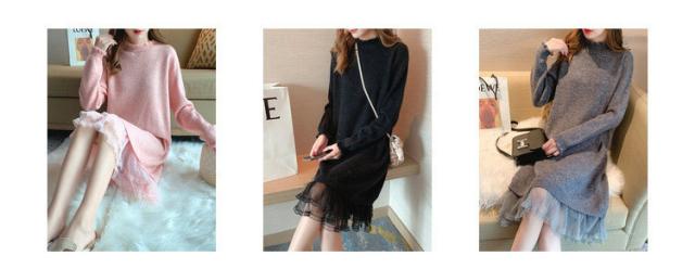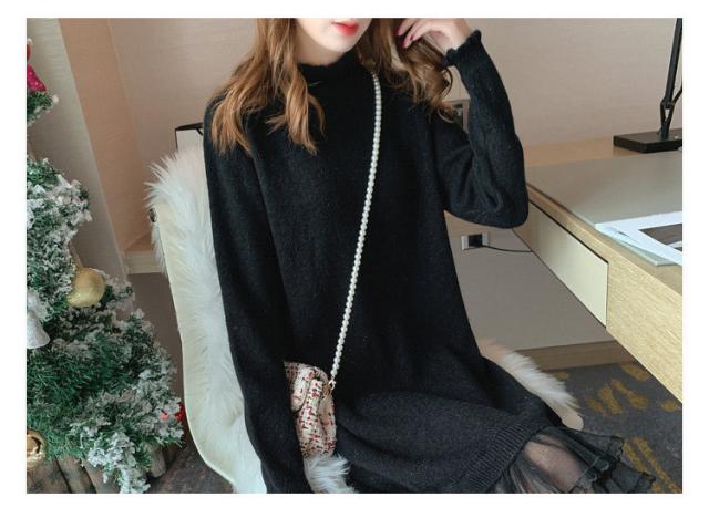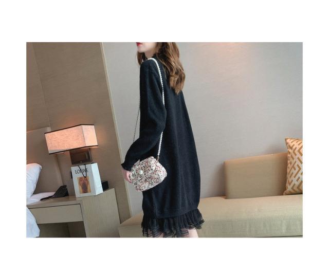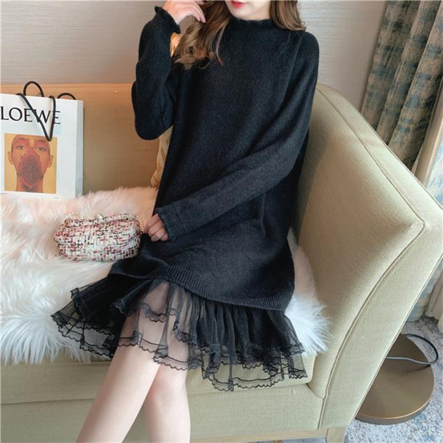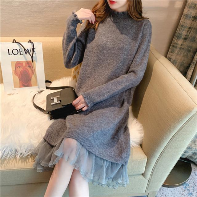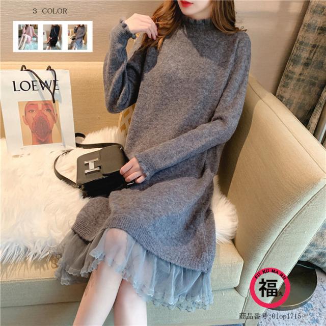ニット ワンピース ニットワンピース ロングセーター ニットワンピ セーター レディース ロング 秋冬 長袖 フリル ハイネック フレア チュール 無地 きれいめ 冬
