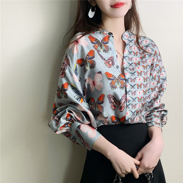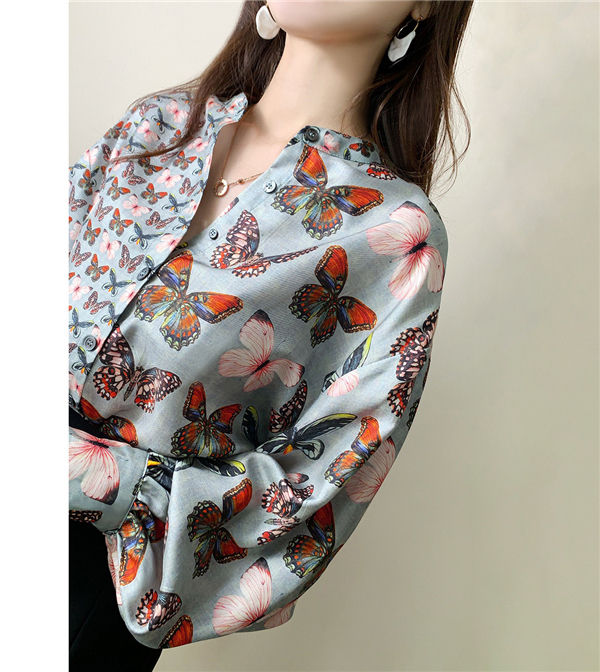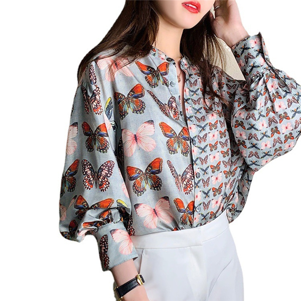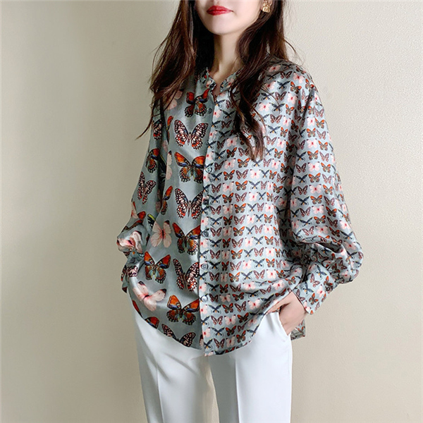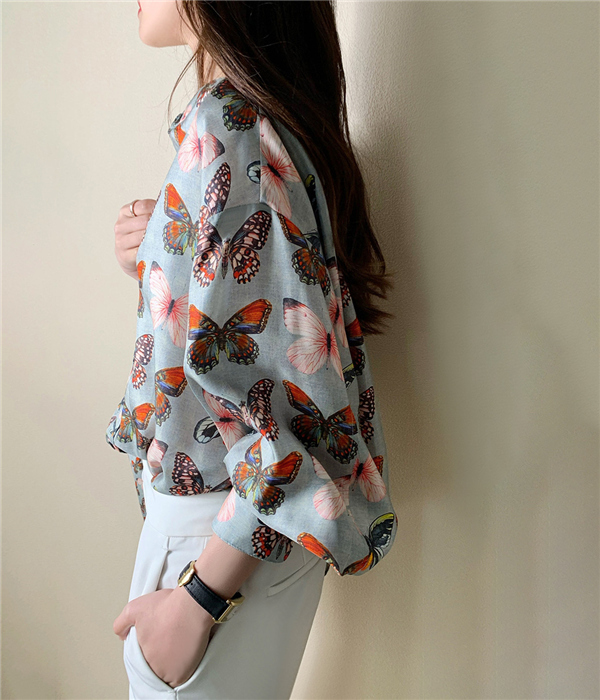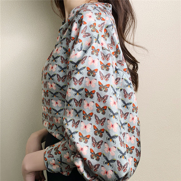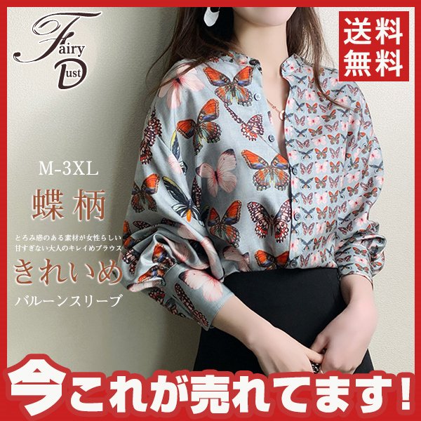 ブラウス バルーンスリーブ ボリューム袖 とろみ クラシカル レディース 長袖 トップス シャツ ゆったり 上品 きれいめ 蝶柄 大人 無地送料無料