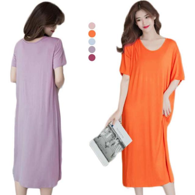 レディース パジャマ カップ付き ワンピース ネグリジェ ロングパジャマ 夏用 薄手 送料無料 大きサイズ 部屋着 寝巻き 女性パジャマ 膝下 丸襟 半袖 無地 シンプル ルームウェア ゆるゆる